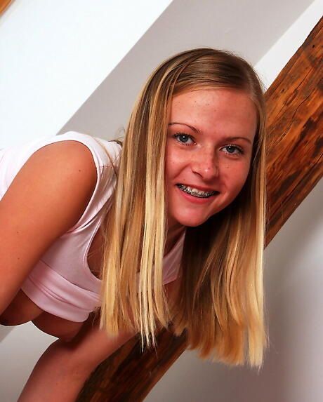 Rangy blonde youthful Petra in fancy skirt jerking off