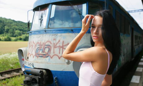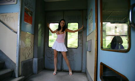 Rangy brunette teen Gwen A in nice skirt exposing big tits and pussy