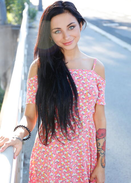 Rangy dark hair teen Dominika Dark in skirt exhibiting her ass and loving sex toy outdoor