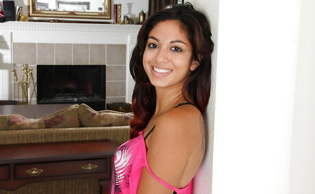 Rangy latin youthful Nadia Reid in tight jeans baring her butt and shaved pussy
