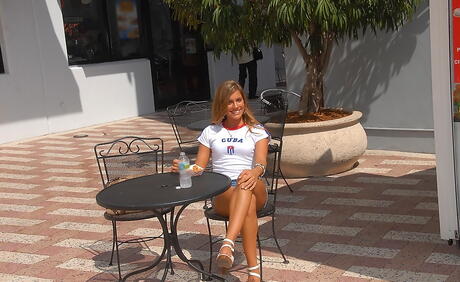 Rangy latina cutie Bella Beyle in shorts exhibiting tiny tits and sexy ass outside