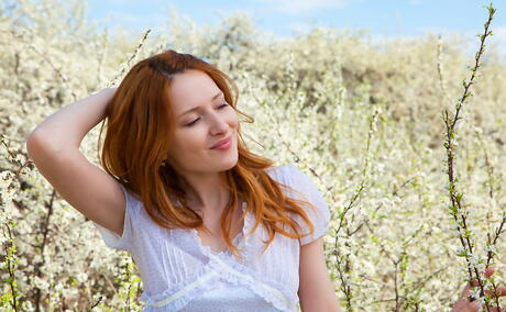 Rangy red-haired youthful Dariya A in nice skirt unveils small tits and hairy twat near the pool