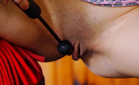 Rangy young Camila Ostende in sexy skirt exhibiting tiny tits and bald pussy