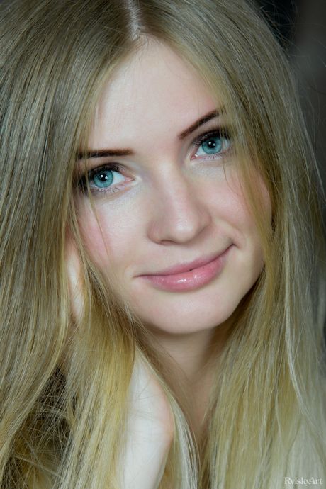 Blonde teen Launs shows her tiny tits and bald pussy in the nude