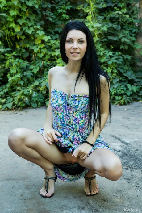 Dark haired teen Rafaella spreads her creamy pussy on a concrete driveway