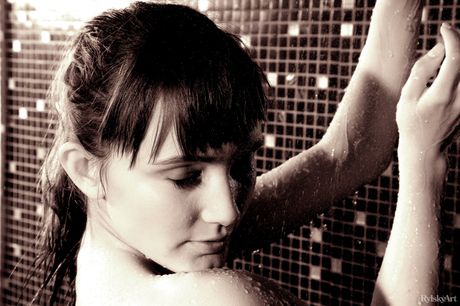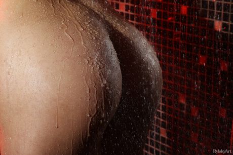 Delicate teen Aria Bella showcases her hairy pussy while taking a shower