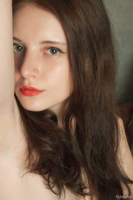 Innocent teen girl with long hair and a slim body poses naked in a solo