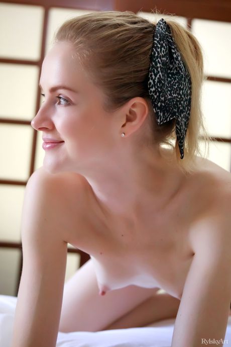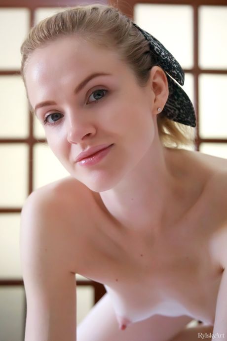 Lean teen Alice May shows her small tits and poses nude in a solo