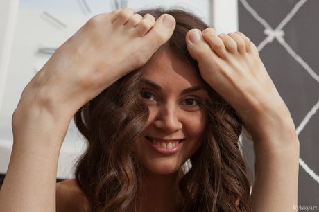 Sexy Latina Astrud strips & spreads her legs wide open to show her hairy pussy