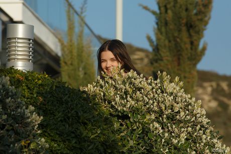 Skinny Russian venus Chanel Fenn poses completely naked on a patio