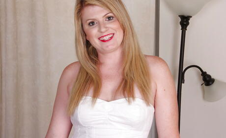 Seductive american blonde aged Lexi Moore in fancy skirt spreading her legs