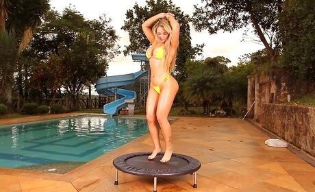 Seductive brazilian babe Angel Lima exposing big titties and butt at pool