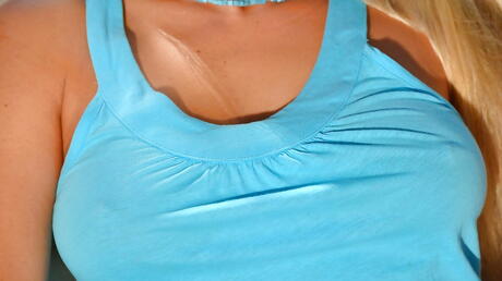 Seductive french blonde cutie Eva Parcker reveals big hooters and shaved pussy outdoor