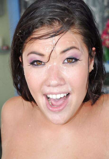 Seductive japanese bombshell London Keyes in sexy skirt deepthroating dick and takes a cumshot on face