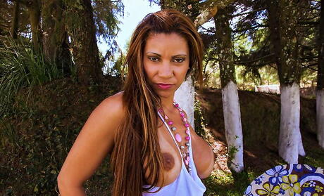 Seductive latina babe Jaque bares big knockers and spreads her legs outdoor