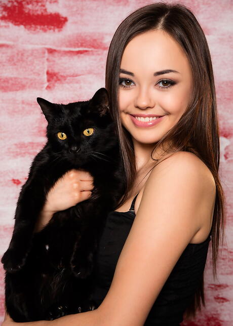 Seductive ukrainian dark-haired hottie Li Moon in hot pantyhose exhibits big knockers and spreads her legs