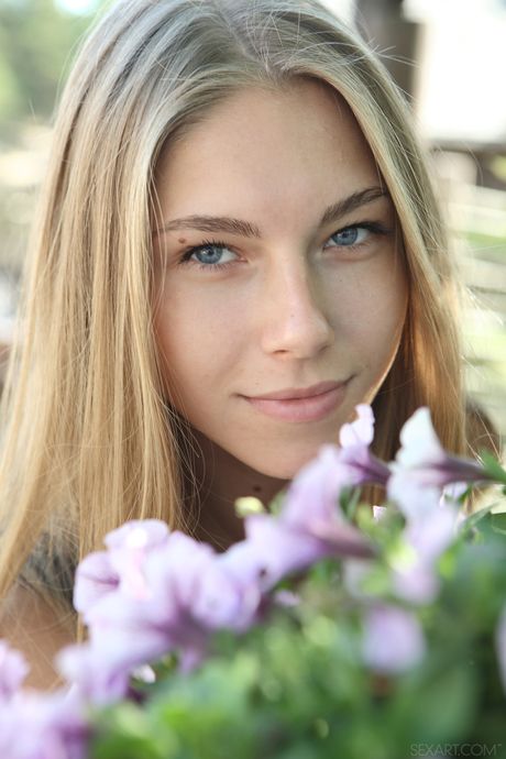 Blonde teen Katherine A fingers her pussy on a blanket in a forest