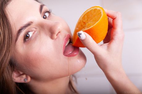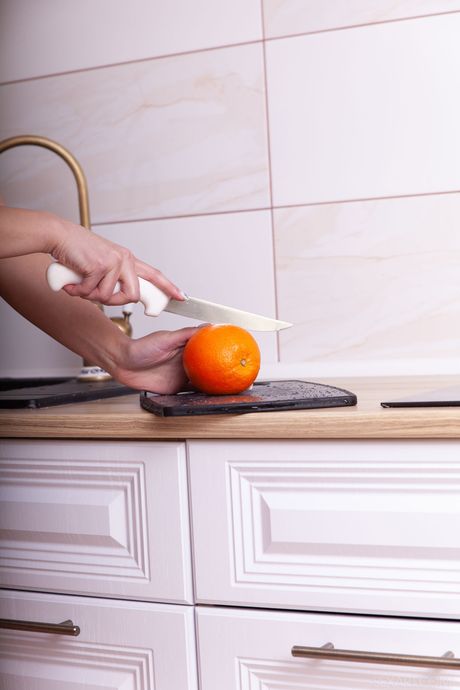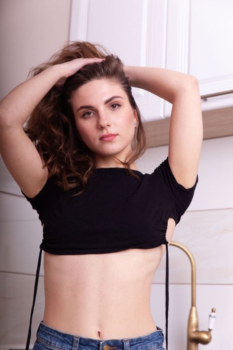 Endearing teen Kassie strips off before fingering her pussy on a counter