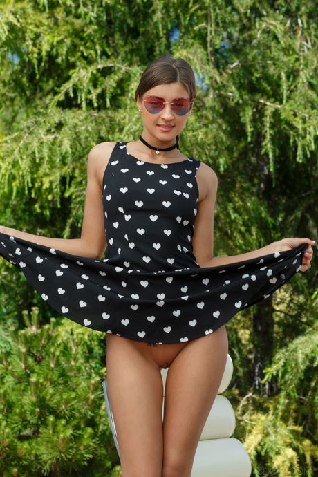 Intriguing teen Melena A removes her glasses and sunglasses before fingering her pussy