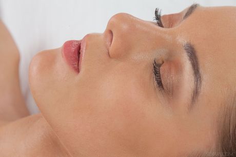 Lean teen Celiota shows her tiny tits & fingers her shaved pussy close up