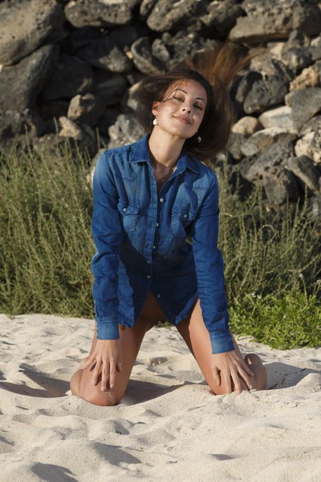 Naked teen Lorena B fingers her pussy on a sandy beach while alone