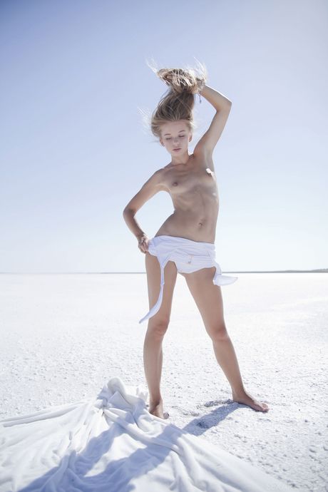 Petite teen Milena D removes a wrap to pose nude on salt flats