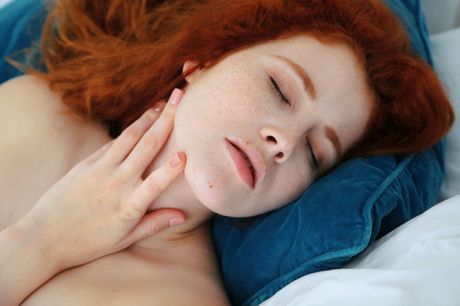 Redheaded teen Adel C fingers her pussy after removing black lingerie