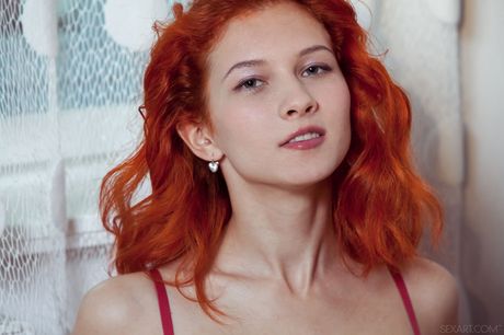 Sexy redhead Ambre shows her big tits & fingers her shaved pussy in a solo