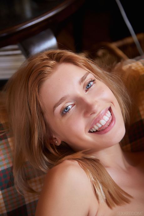 Skinny blonde teen Freya Mayer fingers her pussy while naked on a bed