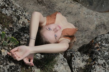 Slender teen Milena D fingers her pussy while naked on a hill