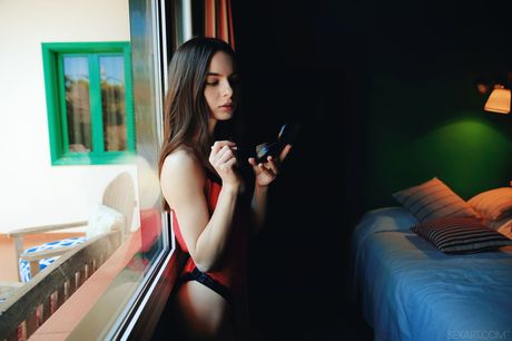 Tempting teen Debora A removes red lingerie before touching her sweet pussy
