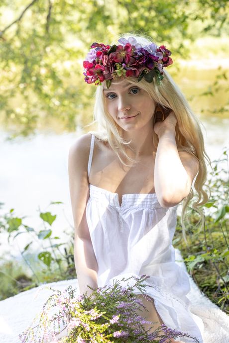 Young blonde Riya takes off everything on a blanket in a forest during solo action