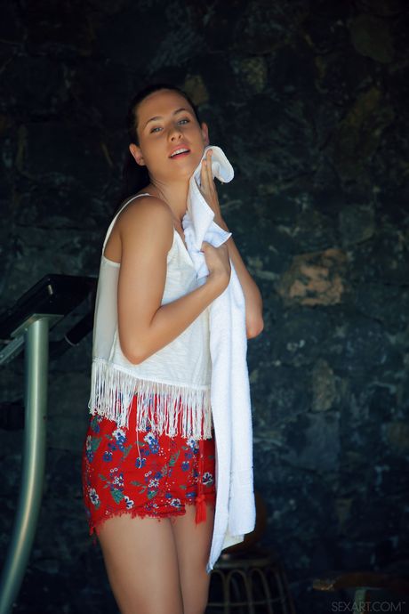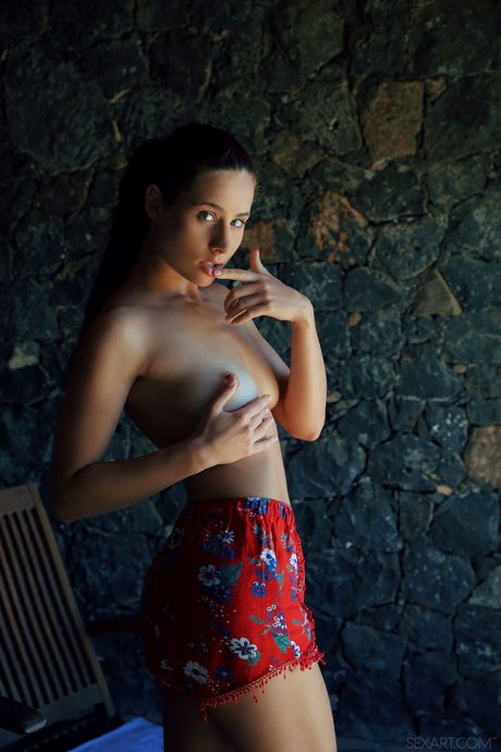 Young brunette Mara Blake gets nude on a patio chair after