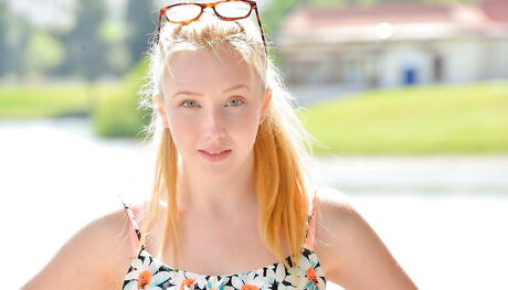 Sexy american blond youthful Samantha Rone exposing small tits and loving dildo outdoor