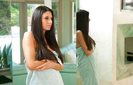 Sexy american brunette Nikki Daniels hard fucked in vagina after sucking rod in shower