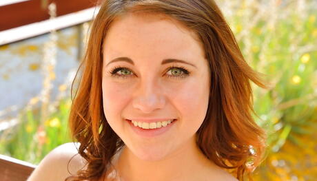 Sexy american brunette youthful Kinsley Eden exposing big titties and playing with toy outdoor