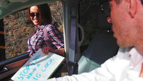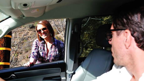 Sexy american Krissy Lynn in fancy shorts robbing on rod and takes a messy cumshot outdoor