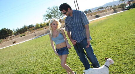Sexy american Madison Scott suck cock and fuck in her bald pussy outside