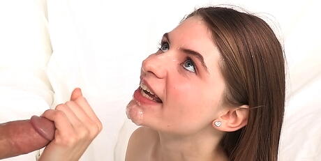 Sexy american teen Alice March blows on huge cock and takes a facial