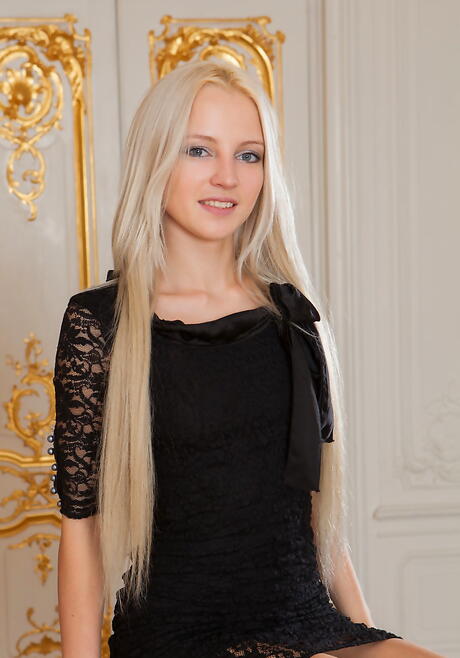 Sexy blond youthful Alysha A in fancy skirt revealing her butt and shaved pussy