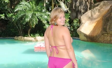 Sexy blonde Ellie May denudes big knockers and sexy ass near the pool