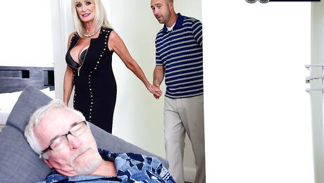 Sexy blonde grannie Leah Lamour jerks off big cock