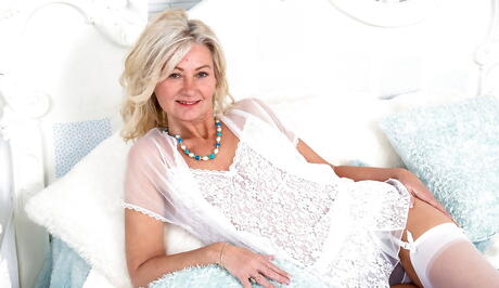 Sexy blonde mature Ellen B exhibits her butt in sexy underwear and hairy pussy