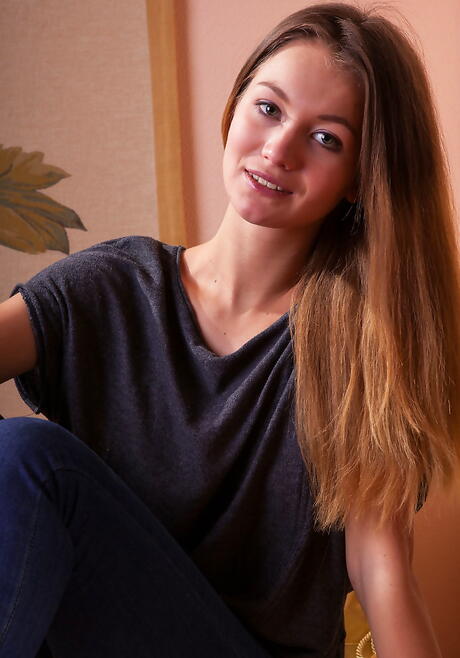 Sexy blonde young Solveig bares small tits and bald pussy
