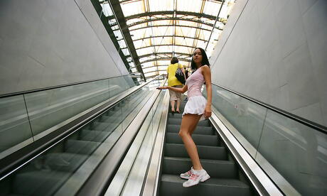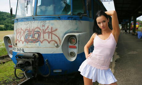 Sexy brunette youthful Gwen A in nice skirt denudes big titties and spreads her legs outdoor