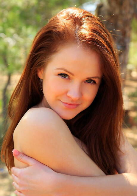 Sexy byelorussiann red-haired teen Alice May unveils tiny tits and bald pussy outside