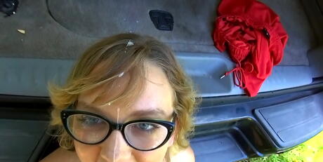 Sexy Chase in sexy glasses work on dick and takes a cum blast on face outdoor