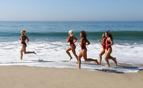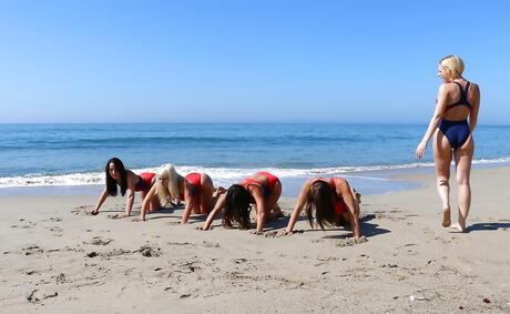 Sexy girls Kagney Lynn Karter, Kayla West, Layla Price and Marley Blaze enjoying amazing lesbian groupsex on the beach
