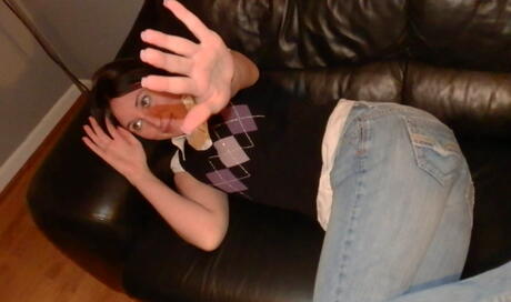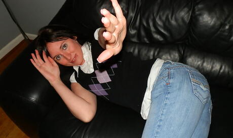 Sexy hungarian dark-haired hottie Peaches in jeans showing tiny tits and shaved pussy