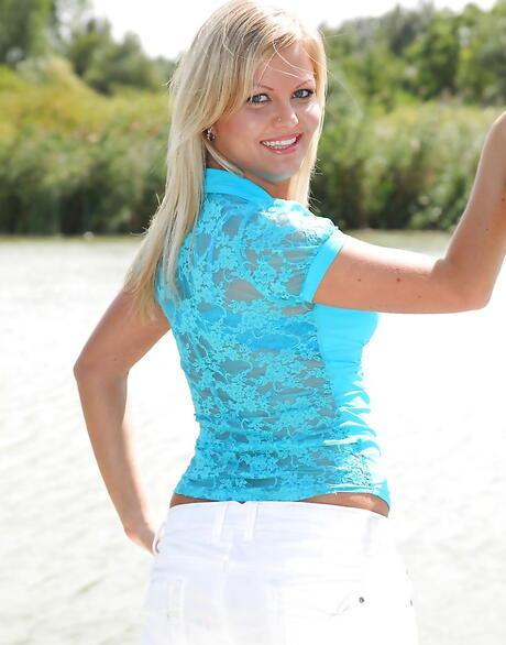 Sexy hungarian milf Sunny Diamond in hot underwear exhibiting big boobies and shaved pussy outside